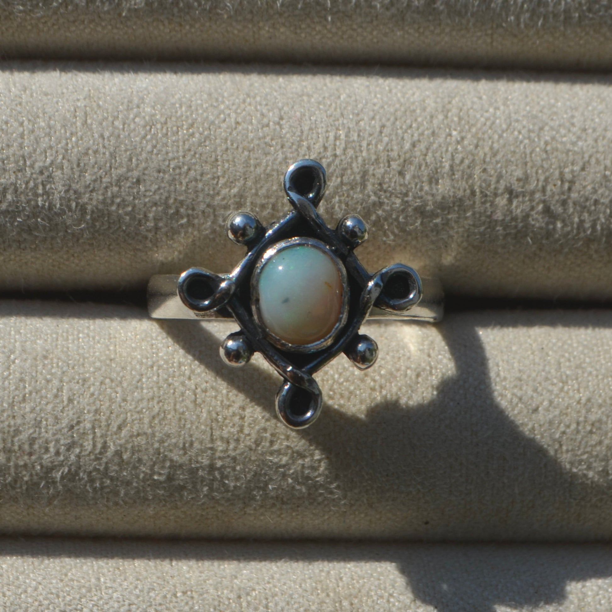 En el centro, un óvalo de ópalo blanco australiano de Coober Pedy revela destellos verdes y luminosos que cambian con la luz. Este tipo de ópalo es conocido por su energía suave, cercana al aura y la claridad mental. Un recordatorio de que tu intuición siempre ilumina el siguiente paso, aunque aún no puedas verlo completo.