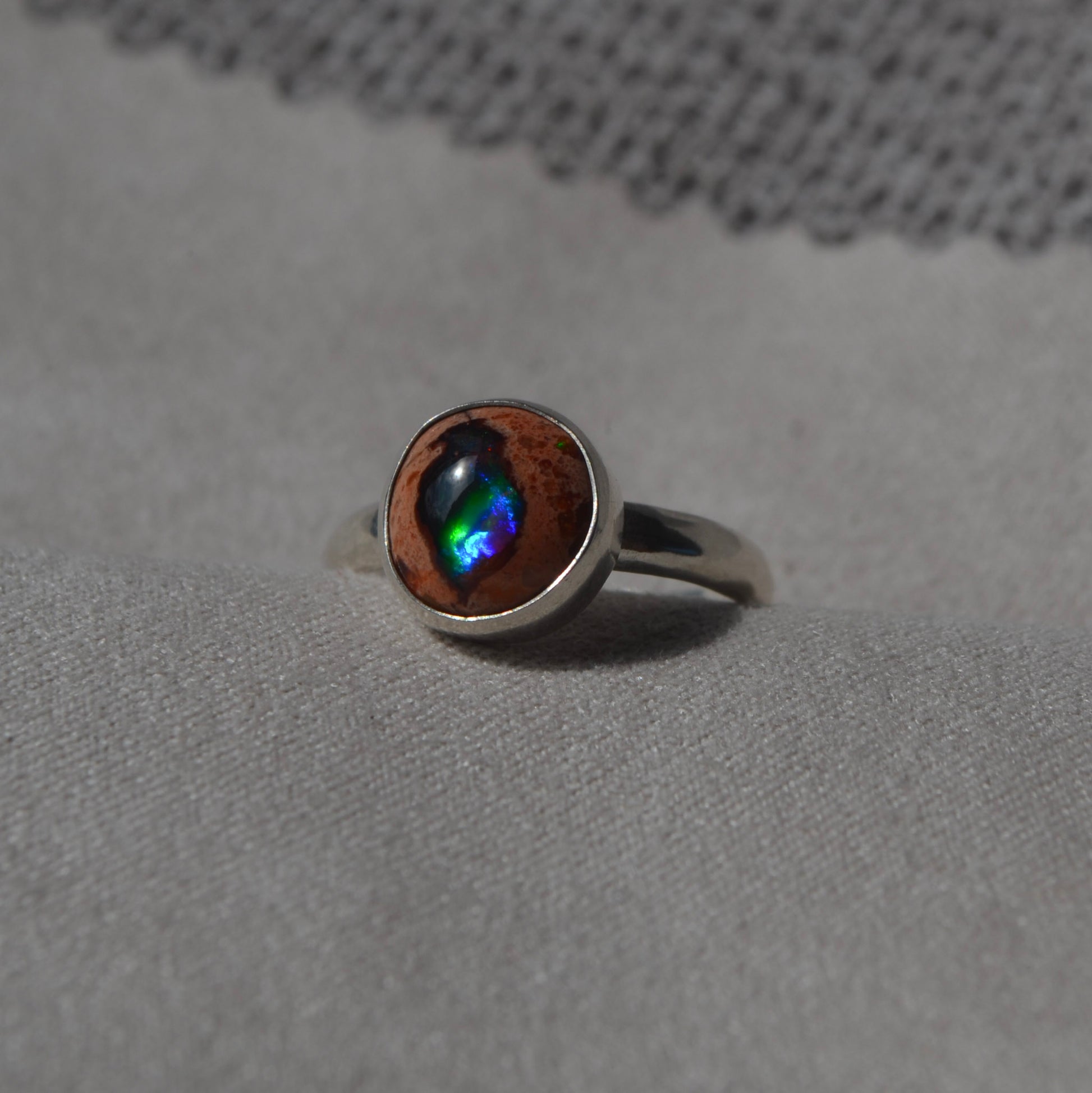 En el centro, un ópalo cantera mexicano con una formación muy especial: el cristal se abre con una forma que recuerda a un ojo de gato, creando un juego de luz hipnótico. Sus destellos aparecen en todos los colores — incluso con un tono morado muy poco común que lo hace aún más único.