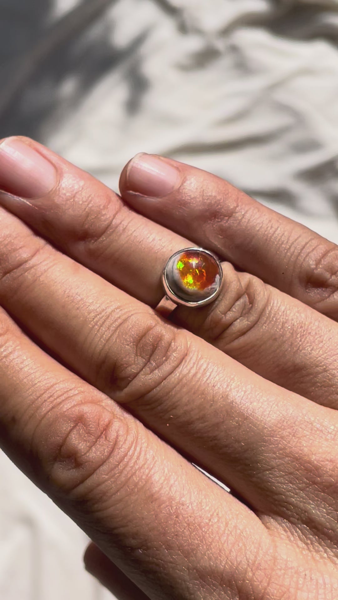 Este Anillo Esencia presenta un ópalo de fuego mexicano en su cantera, conservando parte de la roca que lo vio nacer. Su forma y tonalidad recuerdan a una pequeña luna, suave y misteriosa, con destellos cálidos que se encienden desde su interior.
